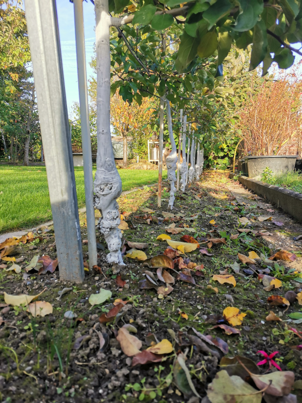An den letzten über 10 Grad warmen Tagen habe ich alle Stämme der Obstbäume mit einem für mich bis dahin unbekanntem Material geweißelt.