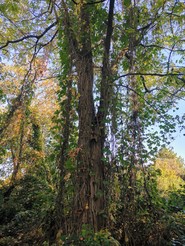 Meine größte Liane (Wisterie) , in normal Grün eher unauffällig, erst Dank Herbstfärbung besser sichtbar. Vielleicht belohnt sie mich irgendwann einmal für jahrzehntelange Geduld mit Blüten: