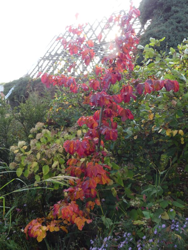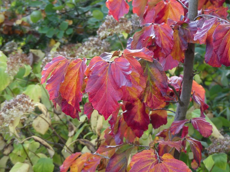 Parrotia 'Felicie' hatte ja regelrecht schwarzrot gefärbt, ist nun aber deutlich heller rot geworden und zeigt auch gelbe Töne.
