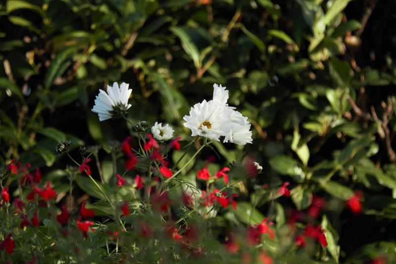 Die Kosmeen sind an die 1,70m hoch und recht wüst, tragen immer noch viele Knopsen