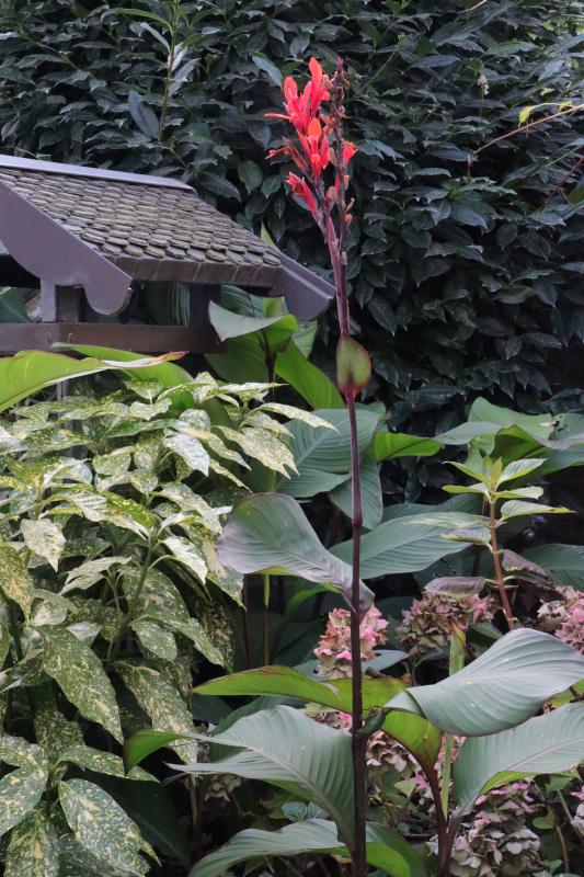 Die Canna muss schon seit Jahren im Boden überwintert und sich ausgebreitet haben, sie taucht sogar unter benachbarten Sträuchern wie Aukuben auf.