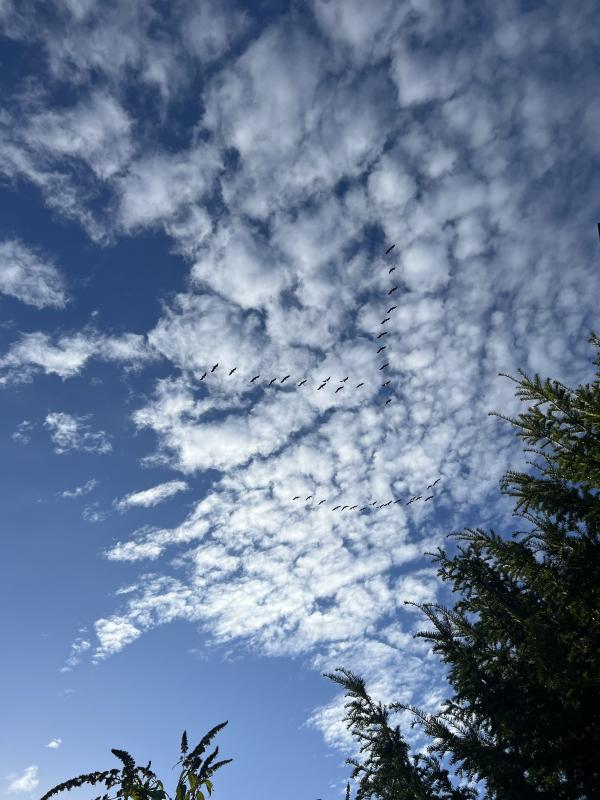 Dutzende Trupps von Kranichen flogen heute über unseren Garten, diesmal sehr tief -nur 30-60m nach meiner Schätzung- das kann dieser Handy Notschuss leider nicht passend wiedergeben