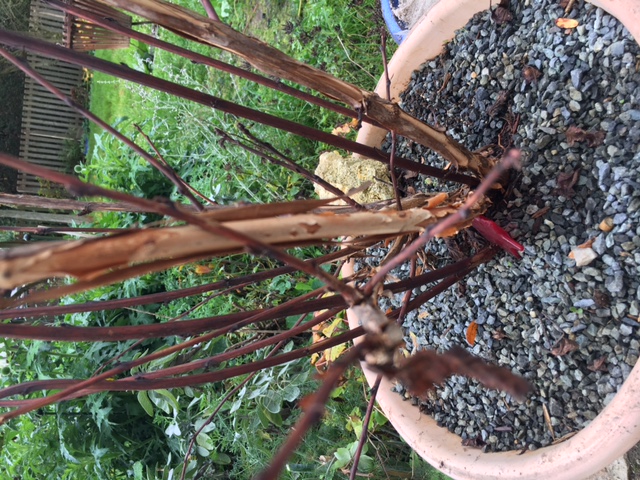 Das ist ein Physocarpus Diabolo, den ich seit diesem Jahr im Topf habe. An den dicksten Ästen hat sich die Rinde gelöst, andere sind noch glatt. Ist das normal? Trockenheitsschaden? Ich habe gegossen, aber bei diesem Sommer? Oder was anderes?