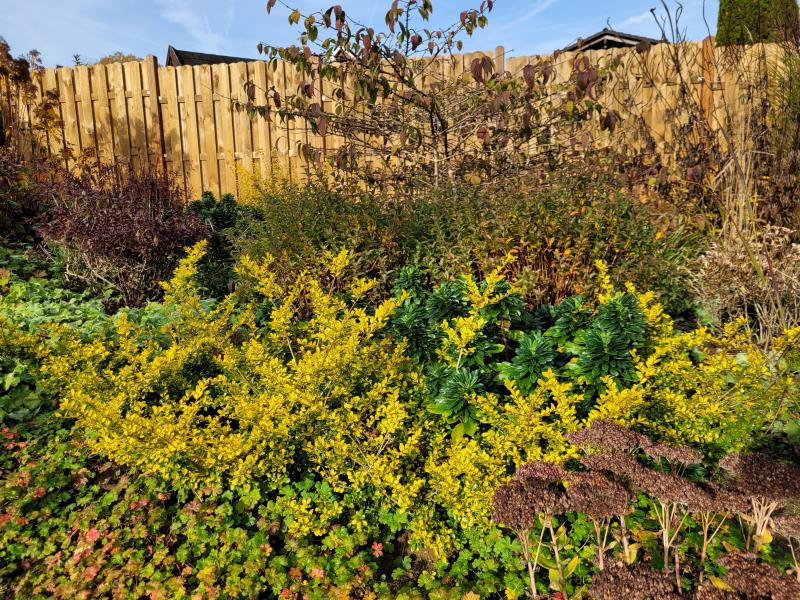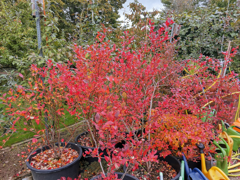 Wenn der Boden ausreichend sauer ist könnte eine Heidelbeere mit ihrer roten Herbstfärbung einen Farbakzent setzen.