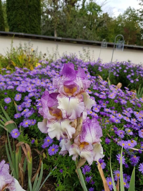 Im Hausgarten hatte mein Großvater innerhalb ein Stück entlang des Zauns eine Reihe dunkelrosa gefüllte Paeonien (`Monsieur Jules Elie´) gepflanzt. Meine Mutter ergänzte das später auf der äußeren Länge um Iris `Lovely Again´. Im Spätfrühjahr haben beide zusammen geblüht, was sowieso passt. Die Nachblüte der Iris fiel dann mit der Herbstfärbung der Pfingstrosen zusammen. Auch nett!