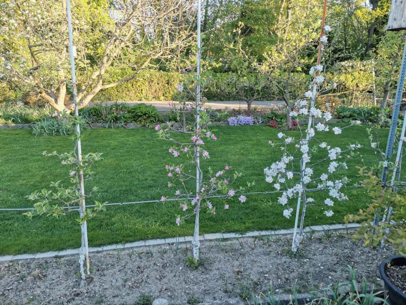 Links Ananasrenette praktisch ohne Blüte, mittig Friesenheimer Eulenpafel muss trotz starkem letzten Jahr ausgedünnt werden und Ribston Pepping rechts möchte sich wohl nochmal tottragen.