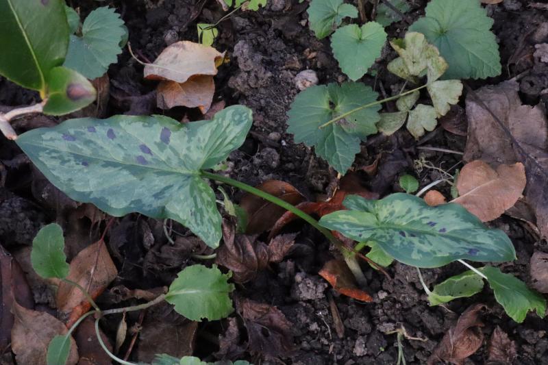 Dieser Zufallssämling ist schon etwas älter und steht ganz woanders. Wie der an seine schwarzen Punkte kommt, weiß ich nicht. Ich bin gespannt auf die Infloreszenzen, da werde ich mehr über die Elternschaft erfahren. Bei Arum italicum und seinen Hybriden scheint die schwarze Zeichnung oberflächlicher zu sein als bei Arum maculatum, die Blattoberfläche wirkt nie so verkrumpelt dadurch.