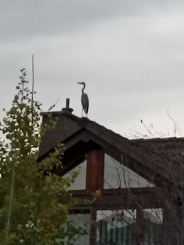 Eine halbe Stunde später war der Reiher wieder da. Dieses Mal saß er auf der anderen Hälfte des Daches des Doppelhauses. Ich habe zwecks Information direkt wieder angerufen. Nun ja, da der Reiher nun anscheinend die kleine Gourmetküche des Teichleins entdeckt hat, müssen sich die Besitzer wohl was einfallen lassen. ::)