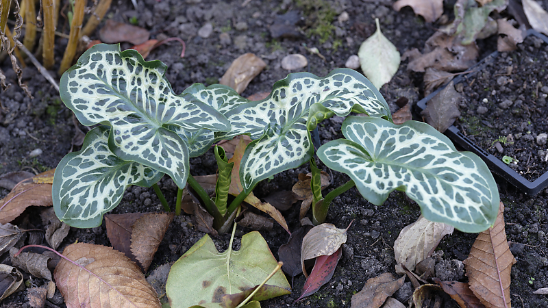 ‚Spottend Jack‘ hat sich gut entwickelt und taucht an verschiedenen Stellen im Garten auf. Er gehört zu den kleineren Arum italicum.