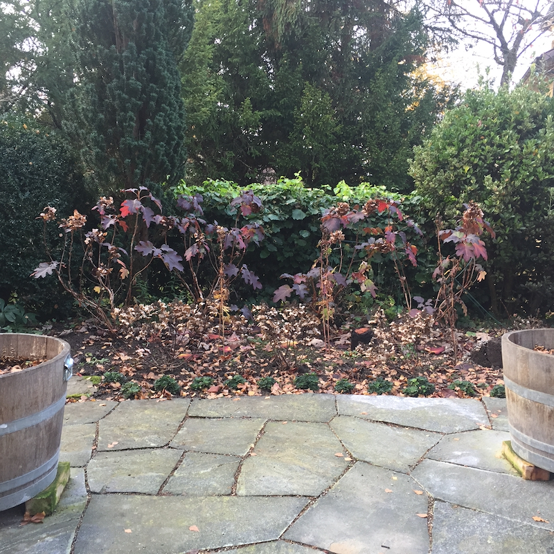 Bei einem Minigärtchen ist ein hübscher Winteraspekt wichtig. Vor allem, wenn man immer drauf guckt. Die eichenblättrigen Hortensien zeigen immer noch in rot und sehr gut gefällt mir die Einfassung mit den Porzellanblümchen. Danke für die Idee, Gartenlady.