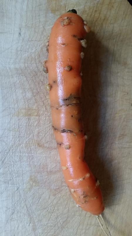 So schlecht sehen die Möhren auch nicht aus. Einige sind aufgeplatzt oder rissig und an manchen Stellen scheint es im Inneren etwas schwarz zu sein. Könnte man großzügig ausschneiden. Und dann sind die Schalen auch nicht mehr so schön glatt wie im Sommer. Sie haben diverse kleine "Pickel". Triebe vermute ich mal. Einfach abschälen und gut ist? Ich habe mal ein Foto von so einer Möhre angehängt.