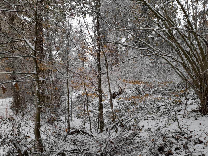 Der Laserscan enthüllte aber auch in voller Schönheit die beiden längsgerichteten Strukturen über die gesamte Fläche. Da wie auf diesem Bild mit gutem Willen zu sehen, der Bach oberhalb des Grundstücks verlief, sind diese Strukturen vermutlich tatsächlich ehemalige Fleuegräben. So hatte ich sie ja die Jahre immer auch bezeichnet. Ich war nur im Zuge der Wegesuche verunsichert. Somit zeigen jetzt zukünftig 3 Linden den Verlauf des ehemaligen Fleuegrabens.