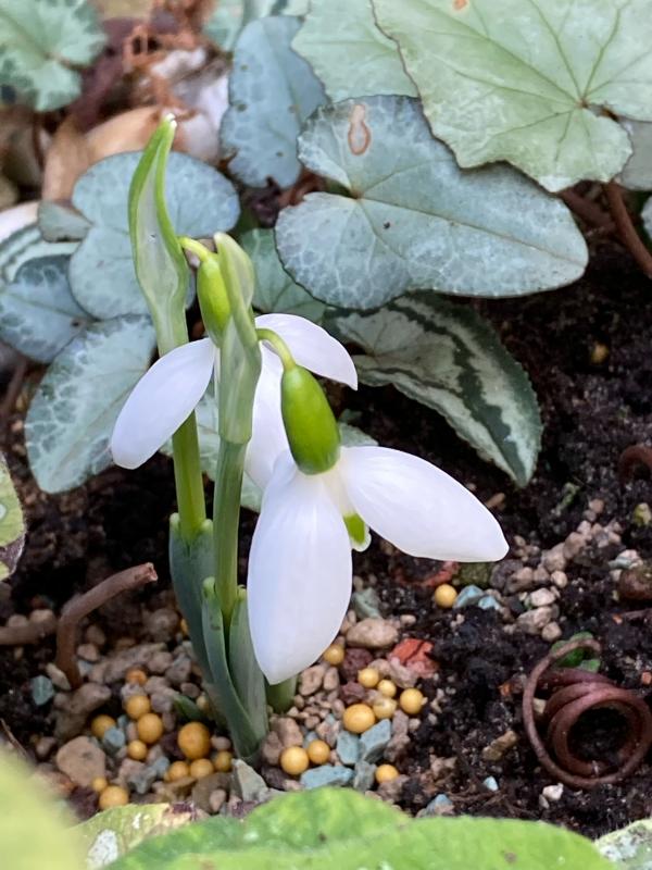 Die beiden letzten Bilder mit den jeweiligen Kombinationen von Galanthus und Cyclamen coum und Arum italicum gefallen mir sehr. Weiß zu weiß passt sehr gut. Hier hat der Frost dem Wachstum von Arum erst einmal ein Ende gesetzt.