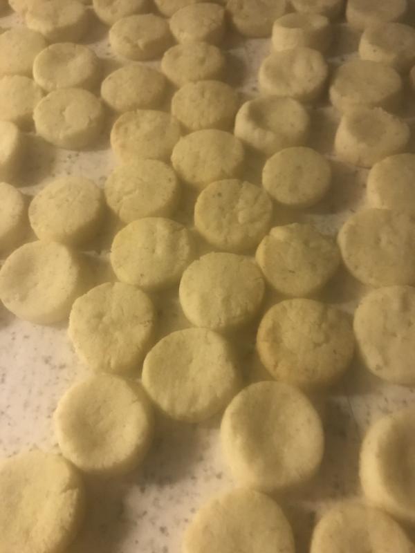 Weil die Teigrollen für die Schoko-Walnussplätzchen nach der Kühlung zu weich waren, habe ich die für die Heidesandplätzchen länger gekühlt, mit dem Ergebnis, dass sie sich nicht schneiden ließen, ich musste sie erst wieder etwas anwärmen.
