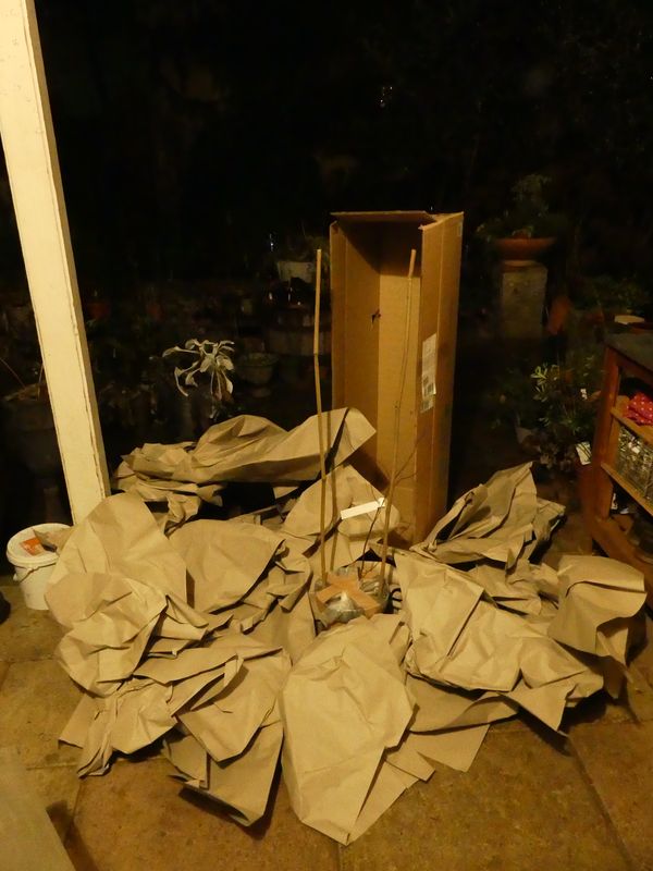 Nun ja, weit gefehlt. Das Sträuchlein hatte keinen cm mehr, als angegeben und ist noch dazu nicht besonders kräftig. Die Verpackung hingegen hatte es in sich. Der Luftraum über dem Pflänzchen wurde großzügig mit Packpapier gefüllt. Ganze 20 Bögen von knapp 100x75 cm zählte ich am Ende. :-X