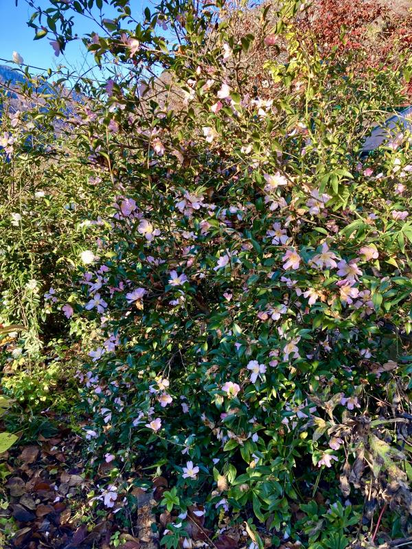 Ganz oben am Steilhang blühen C. oleifera und dahinter Winter‘s Star noch immer um die Wette…