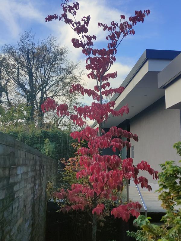 Irgendetwas verleitete mich letzten Herbst, noch eine weitere Franklinia zu kaufen. Während das schon größer gekaufte Exemplar am Gartenhaus ziemlich leidet, sieht diese hier richtig gut aus und färbt wunderbar.