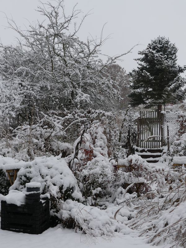 Ja, komplett flach. Der knapp unterarmstarke Hauptstamm lag waagerecht. Ich sehe im Beet durch den Schnee nicht, wo ich gut hintreten kann, daher habe ich es noch nicht ganz genau inspiziert, ob was angebrochen ist. Selbst wenn sie nur umgebogen ist, wird es ohne kräftigen Pfahl wohl kaum wieder in die Senkrechte gehen. Nach dem Abschütteln des Schnees sah es noch nicht wirklich gut aus.