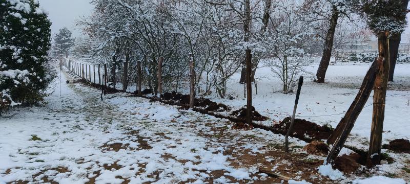 Dreimal hundert Meter Spanndraht sind an den Zaunpfosten und die restlichen 50 m Strecke sind zum Versenken des Zauns nun auch aufgegraben. Ich habe gleich noch die Gelegenheit genutzt, einige zu nahe Eichensämlinge im nachbarlichen Pflaumendickicht zu roden, der größte hatte schon mehr als 5 m.