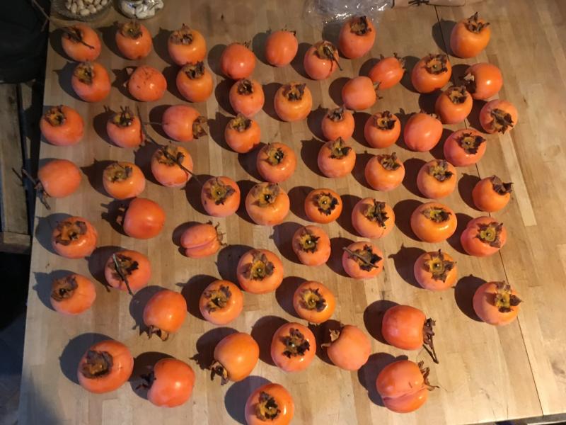 Die letzten zwölf Kakis habe ich jetzt auch noch geerntet. Nachmittags und Morgen soll es regnen, ab Sonntag gibt’s Schnee und ab Montag mindestens eine Woche Dauerfrost. Wenn nicht mehr. Das halten sie nicht aus.
