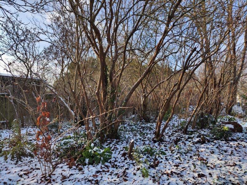 Auch die Trockenmauer am Hang tritt plötzlich klar hervor, der "Waldgarten" wirkt auf einmal viel heller, und die Immergrünen leuchten plötzlich aus der Schneedecke hervor, genauso wie die leuchtend orangeroten Beeren von Iris foetidissima.
