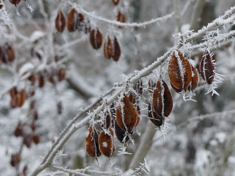 Seit einer guten Woche hat der Frost den Garten fest im Griff. Heute hat zwar die Sonne gefehlt, dafür gab es aber Raureif.
