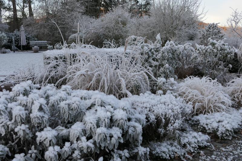 Den Knospen meiner neu gepflanzten Zierkirsche wird der Winter hoffentlich nichts anhaben, auch der Sommerflieder treibt nach dem Rückschnitt wieder zuverlässig aus, und die Hohen Fetthennen zählen ohnehin zu den robustesten und ganzjährig ansehnlichsten Pflanzen überhaupt. Heute und morgen noch wird die Natur zu Eis erstarrt sein, ab Montag soll dann das Weihnachtstauwetter einsetzen...