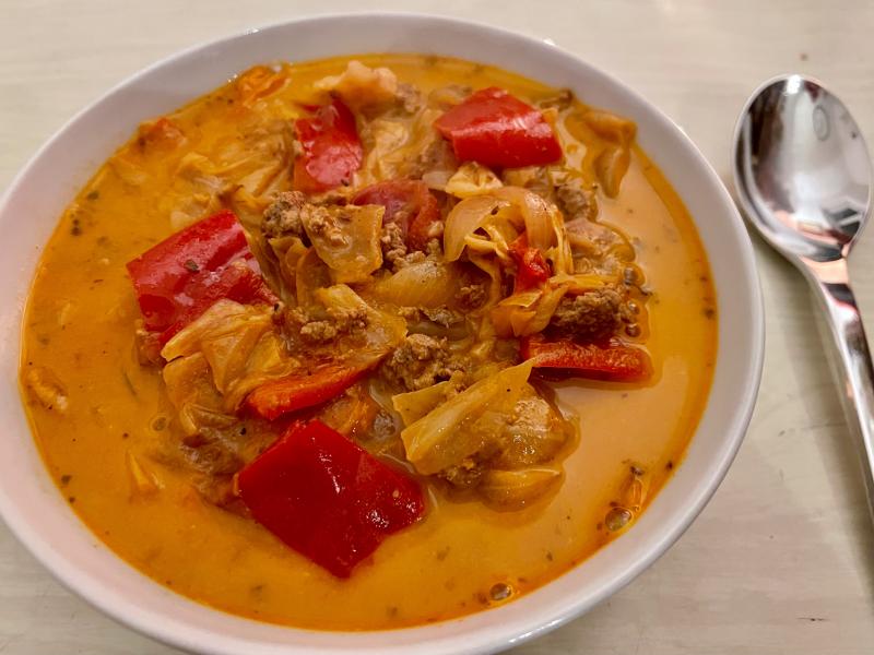 bei uns gebratener spitzkohl mit höri-bülle, roter spitzpaprika, hackfleisch, tomätli, tomatenmark, etwas rahm samt salz, pfeffer, kümmel, majoran und zeugs. 8)