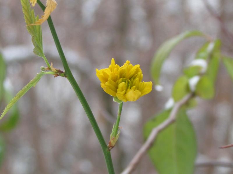 Aus dem Quittegestrüpp hat mich dann doch tatsächliche eine halberfrorene Blüte der gefüllten Kerrie angelächelt. An einem von mehreren zwei Meter langen gesunden Ruten, dachte eigentlich das Ding sei tot oder so gut wie. Solange es der Pilz nicht findet, lasse ich es stehen, aus alter Verbundenheit. Würde ich so oder so heutzutage nicht mehr pflanzen, zu meinen Anfangszeiten wollte ich es aber unbedingt mal haben.