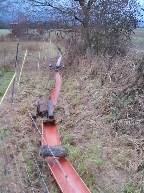 Im letzten Büchsenlicht immerhin fertig geworden. Und by the way: Vielen Dank an Folkert, der mit Argusaugen über dieses Grundstück wacht. Es ist das Erdfallgrundstück. Diesen Herbst hat er pingelig geschnitten, damit nur ja der Graben frei ist. Und hinten tiefer abgestochen, damit es sich ja nicht staut. Ungefähr da wo der Baum rechts neben dem Graben steht, war der gar nicht kleine Erdfall. Kleine Klauen verdichten eifrig den Untergrund. Das ist auch nötig. Da sind Bigpack Holzschnitzel drin. Man muss sich wundern.... allerdings gab es im Anschluss den gesamten Grabenaushub oben auf und über Monate wurde immer wieder verdichtet. Ich hatte damals nicht zu hoffen gewagt, dass wir das Unglück aufhalten könnten. Das wäre eine Gaudi geworden, wenn sich der Hang in den Riepenbach ergossen hätte :P dahinter ein hübsches Stauwerk und am Tag X eine Flutwelle durch die Dörfer ::) brrrr