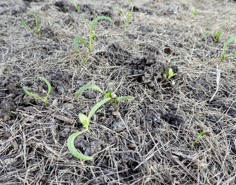 Am selben Tag gesät, aber viel später gekeimt: Spinat. Und die Regenwürmer sind auch wieder aktiv ...