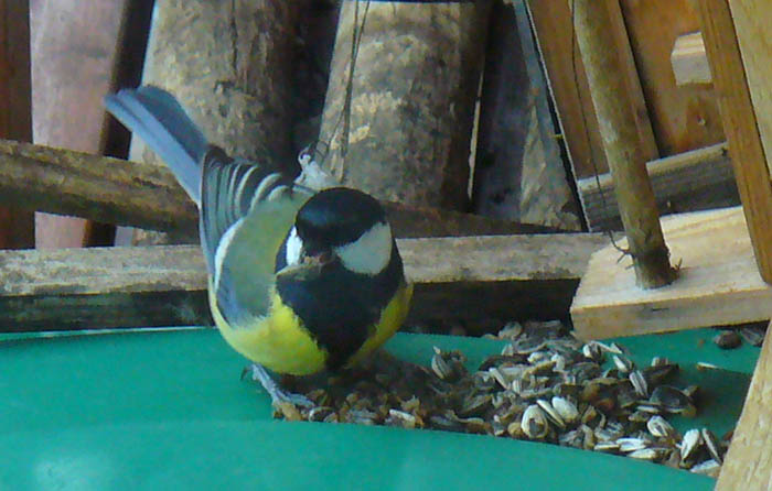 Und eine Kohlmeise.Wir haben wegen starkem Wind das Futterhäuschenzur Wand gelegt, dabei fielen Sonnenblumenkerne ´heraus. Sie machte sich gleich darüber her.