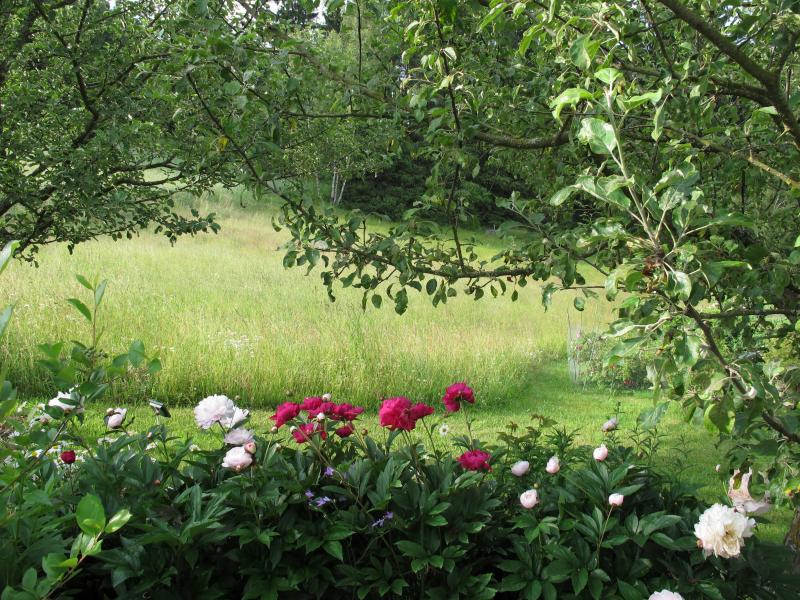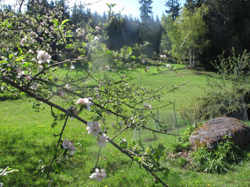 Mir hat dieser Thread ein paar Stunde Beschäftigung mit meinen Fotos und endlich etwas Übersicht gebracht, und nun muß ich auswählen. Welche Ecke, welcher Blick? Es fällt nicht leicht, wenn es erlaubt ist, könnte ich später noch Bilder aus anderer Perspektive zeigen. Zum Teil sind es ältere Bilder, was man auch am Wachstum der Bäume erkennt. So beginne ich mit einem Ausblick nach Süden, mehr Landschaft als Garten, was aber wesentlich ist für die Vorstellung.
