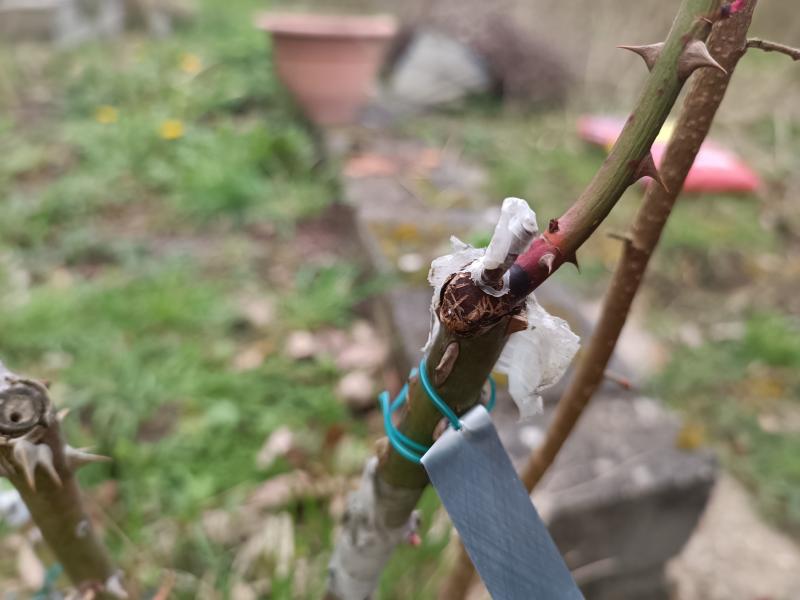 ... Tipsy treibt nach wie vor - auch nach der frostigen Nacht mit -3' Anfang der Woche. Einige andere moderne Teehybriden, die ich auch auf Stämmchen veredelt hatte und ungeschützt waren, waren da nicht so Frost tolerant...Die Tees im unbeheizten Glashaus trieben alle kräftigst... Bei den ausgepflantzten Tees ist es uneinheitlich. Mme A. Mari, die sonst immer sehr unbeeindruckt vom Winter war, ist auf den Boden runtergefroren. Marechal Niel hingegen hat seine 2m Ranken behalten...