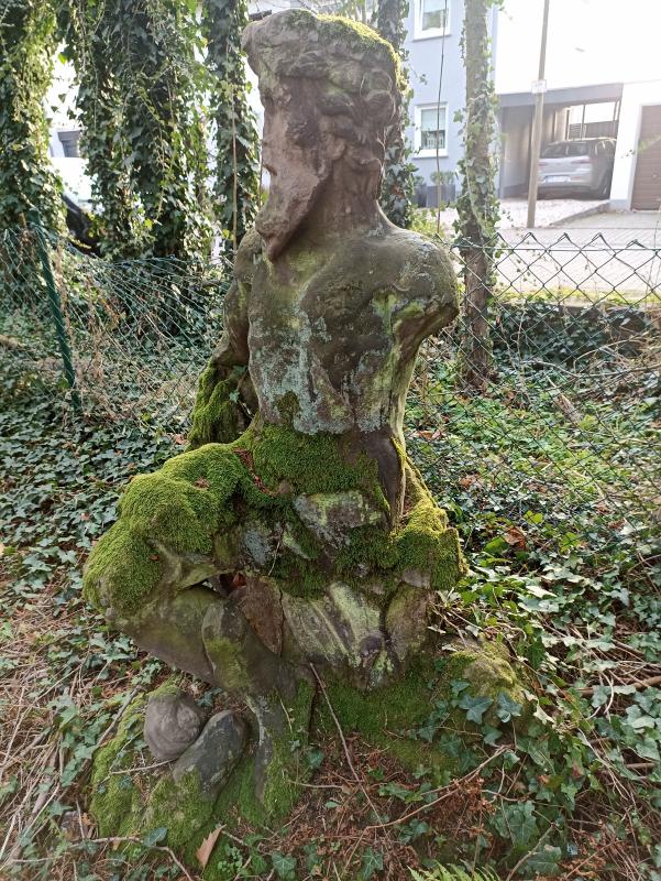 Laut Besitzerin ist es übrigens ein Wassergott (vermutlich Neptun oder Rhenus, wir liegen hier ja direkt am Rhein). Es war nämlich ursprünglich eine Brunnenfigur, den zerstörten leicht ovalen Brunnen gibt es auch noch, er liegt nun nicht mehr ganz gartenmittig. Sie haben den Wassergott irgendwann mit einem Lastenkran aus dem Brunnen gehievt und an der jetztigen Stelle aufgestellt, damit er nicht noch weiter umfällt. Der Garten steht schon lange nicht mehr Denkmalschutz, nur noch das Haus, seit die Kommune vor zig Jahren ein Stück von dem historischen Garten incl. hoher Mauer abzwackte, um direkt daran anschließend eine Straße für ein großes Neubaugebiet zu bauen. In dieser Zeit ging man mit Denkmalschutz noch anderes um. :-\