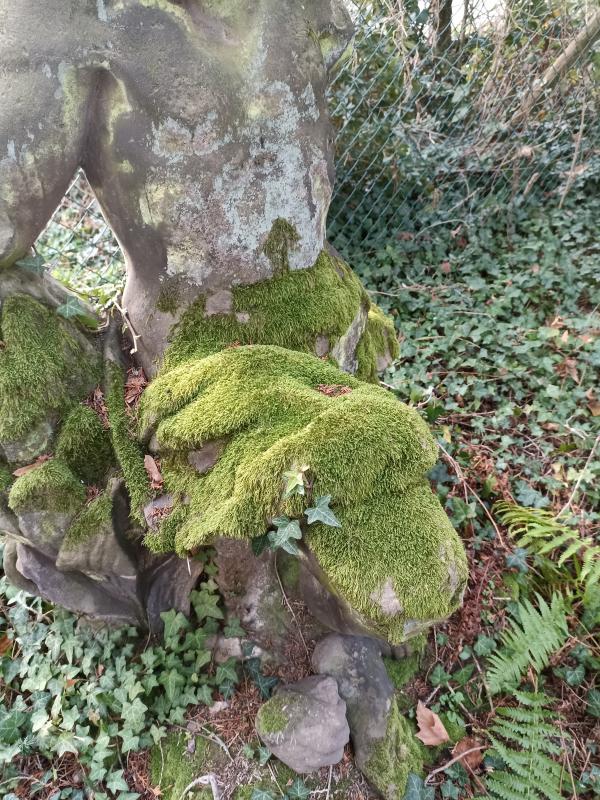 Sandstein kann man natürlich auch restaurieren, dafür gibt es Fachrestauratoren. (Manchmal werden aber auch für den Außenraum Kopien erstellt und die Originale im Innenraum weiter gelagert oder ausgestellt.) Diesen Figur hier würde ich so lassen, wie sie ist, sie sieht doch herrlich aus so überwachsen von Moos und Flechten. In einem alten Privatgarten, wo auch der Brunnen dazu nur noch rudimentär vorhanden ist, darf das doch auch so sein.