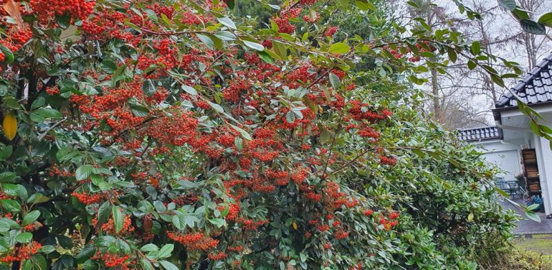 Für die Vögel als Futter und als Augenweide für mich habe ich im neuen Garten zwei Vogelbeerbäume (Sorbus aucuparia) und mehrere Cotoneaster lacteus gepflanzt.