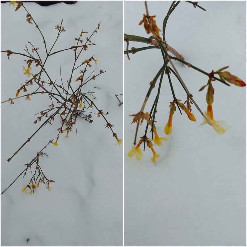 Abeliophyllum blühte hier dieses Jahr schon im Januar. Jetzt hat der Frost dem erstmal ein Ende gesetzt, sind aber noch Blütenknospen da.