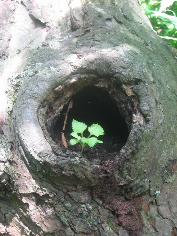 Astloch im Stamm eines alten Apfelbaums mit Sämling von???