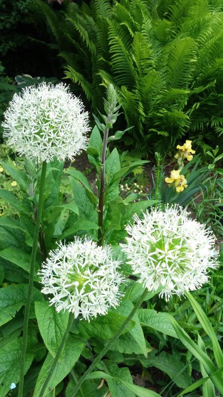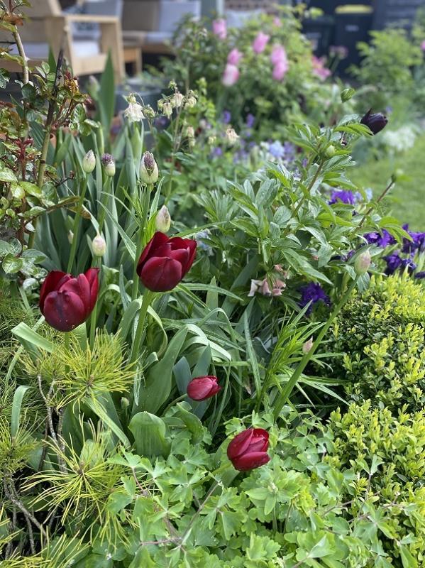 Hier auch ein paar Alliümer mit Akeleien, im Hintergrund rechts Schleifenblume (Iberis) und links Polsterphlox.