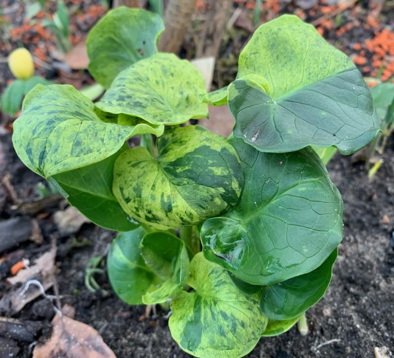 Eigentlich träume ich von einem gelbblättrigen Arum italicum , die gescheckten sind mir oft zu unruhig. Arum maculatum ´Bakovici´wächst ja wie blöd bei mir, treibt aber gerade erst aus und ist auch sehr unregelmäßig in der Zeichnung.