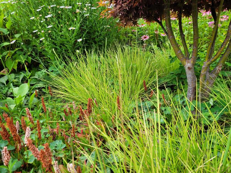 Leider noch nicht fertig geworden, es regnet heute den ganzen Tag. Schön niedriges, leuchtend grünes Gras auch für die Flächenpflanzung, Rückschnitt im Frühjahr vorausgesetzt. Außerdem teile ich es ab und zu, wenn es zu staksig wird. :D