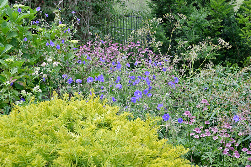 Geranium 'Orion' und 'Brookside' sind Weberpflanzen, wachsen und blühen an langen Stängeln, brauchen andere Pflanzen, die sie durchweben können. Sie blühen aber im Juni, zur Blütezeit der Hems sind sie vermutlich verblüht.