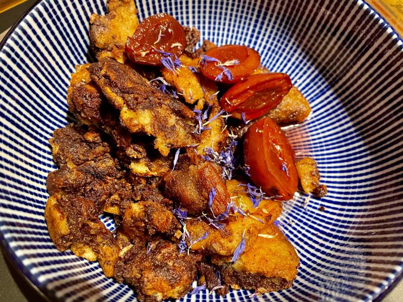Außerdem gab es Chicciole mit Hokkaido, Kohlsprossen und einem Sugo aus Zwiebel, Knoblauch, Chili, Tomatenmark und getrockneten Tomaten, am Schluß 2 Tropfen Orangenöl und Parmesan.
