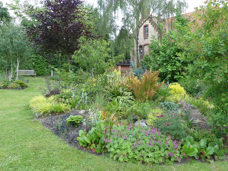 Im Moment knallt's ganz schön. :) Zumindest im Mittelbeet. Im Herbst musste ich hier Persicaria wallichii roden, der auf einer Fläche mit gut 3 m Durchmesser alles platt gemacht hatte. :P Von der anderen Seite sieht man das zum Glück nicht. Hier fallen nur die etwas zögerlich wachsenden Hakonechloa auf, die von einer Wühlmaus unterwandert wurden.