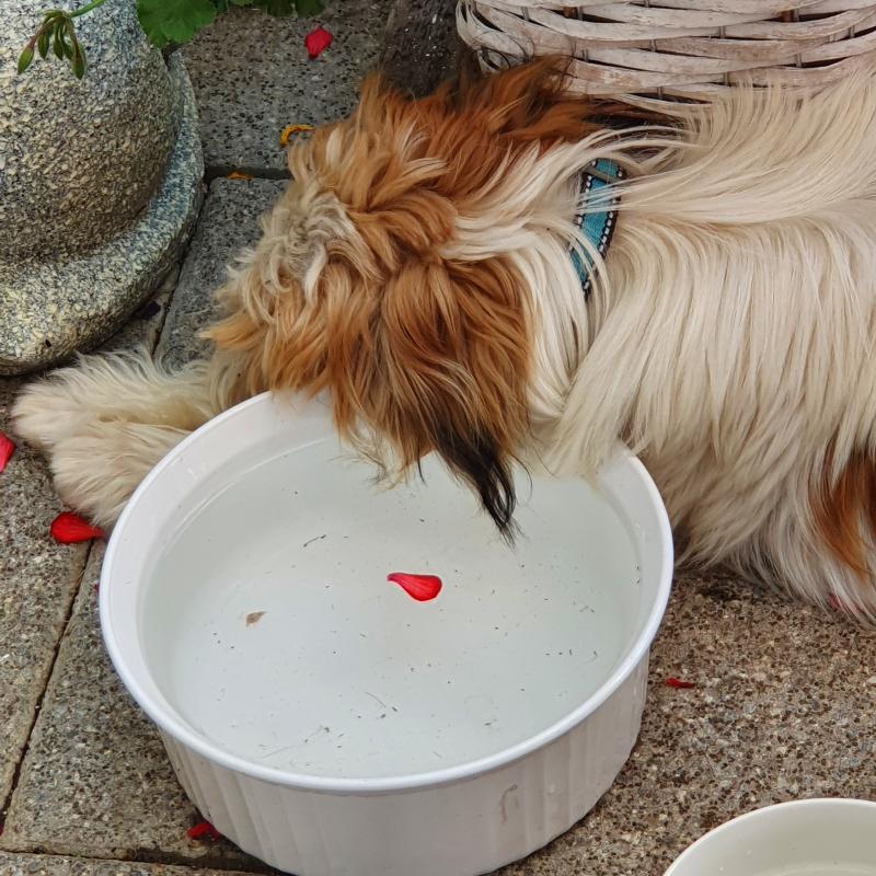 Schlafender Hund mit einem gekühltem Ohr und rotem Pelargonien Blütenblatt...