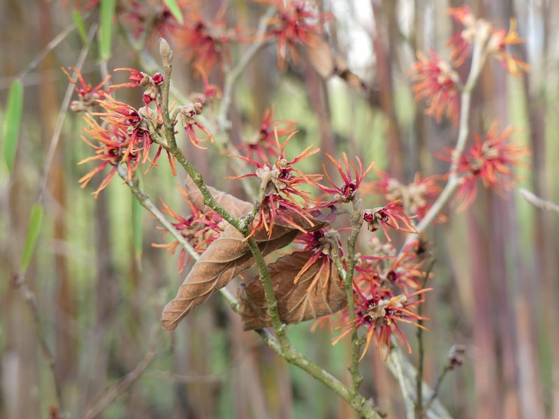 Hier blühen inzwischen fast alle Hamamelis. Unter anderem 'Twilight'.