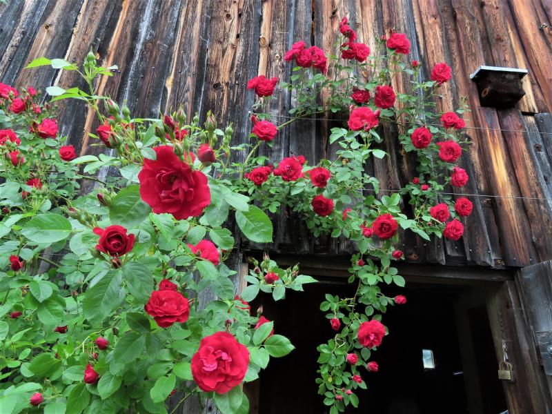 Ich knüpfe an die Rosen an, in Farbe Rot mit blauem Rittersporn.