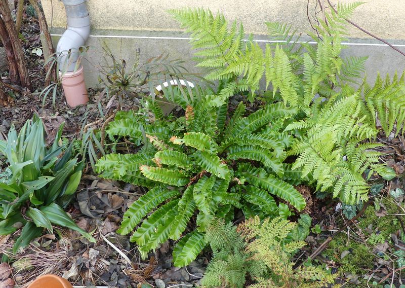 Manche der wintergrünen Farne sehen nach dem Kahlfrost fürchterlich aus. Dieser ist völlig unbeschädigt.