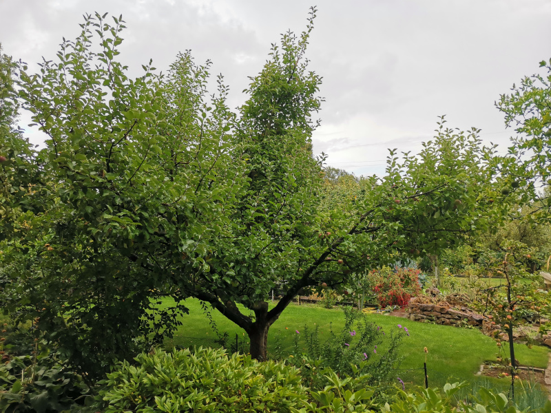 Das gilt prinzipiell auch für den echten Mehltau des Apfels. Hinzu kommt Schorf, weil der von unverrottetem Falllaub mit Regenspritzern wieder auf die Bäume hochwandert. Schorf wird allerdings immer weniger ein Problem, weil die Jahre trockener werden, da fehlt ihm die Feuchtigkeit. Auf der anderen Seite werden die Winter immer milder, so das verseuchtes Laub vom Vorjahr besser verrotten kann, also weniger Schorfsporen im Frühjahr für die Primärinfektion zur Verfügung stehen.